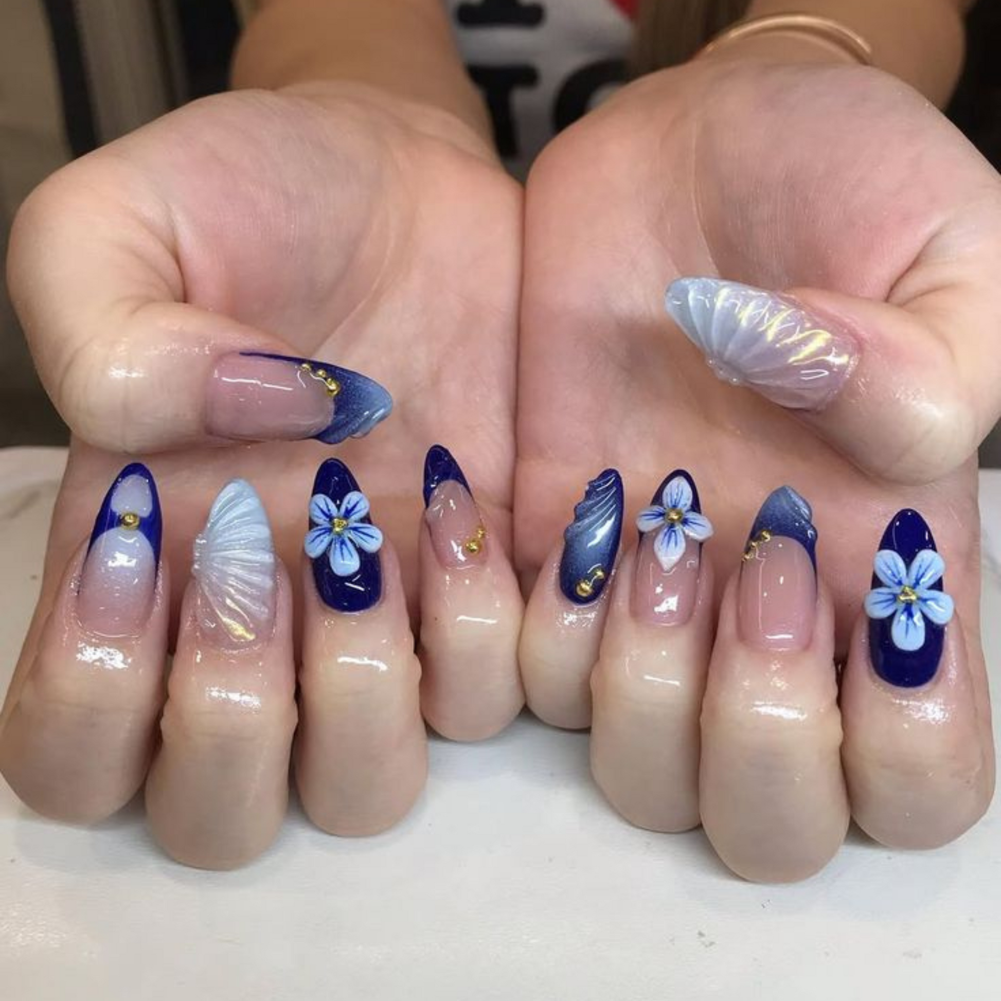 Delicate as a memory and bold as love, these hand-crafted press-on nails blend deep sapphire blue with soft nude tones, adorned with dainty 3D forget-me-not flowers and golden accents. A perfect balance of elegance and emotion—made to leave a lasting impression.