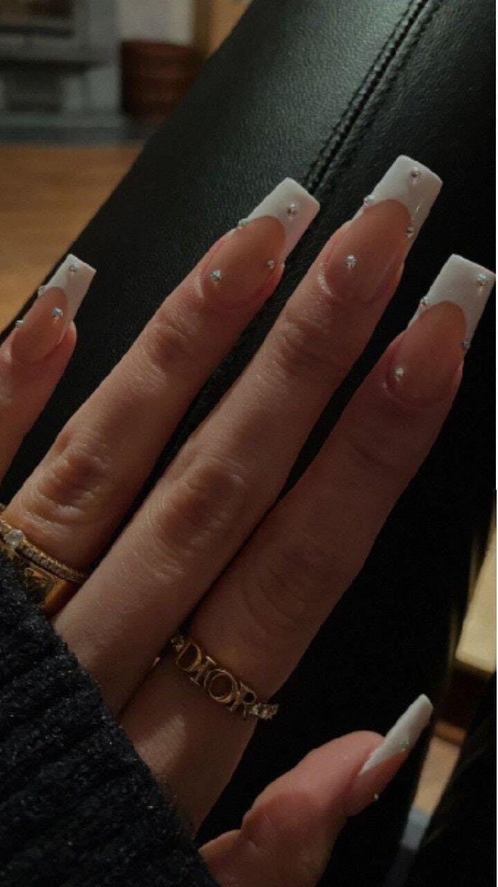 "Pearl Drop" is an elegant and sophisticated nail design that blends classic charm with a touch of glamour. Featuring a soft, translucent nude base, each nail is delicately adorned with miniature crystal studs that shimmer like dewdrops in the light. The look is elevated with a crisp white French tip, giving a timeless finish with a modern twist. The subtle sparkle of the rhinestones against the clean, glossy backdrop captures the essence of understated luxury—perfect for both special occasions and everyday elegance.